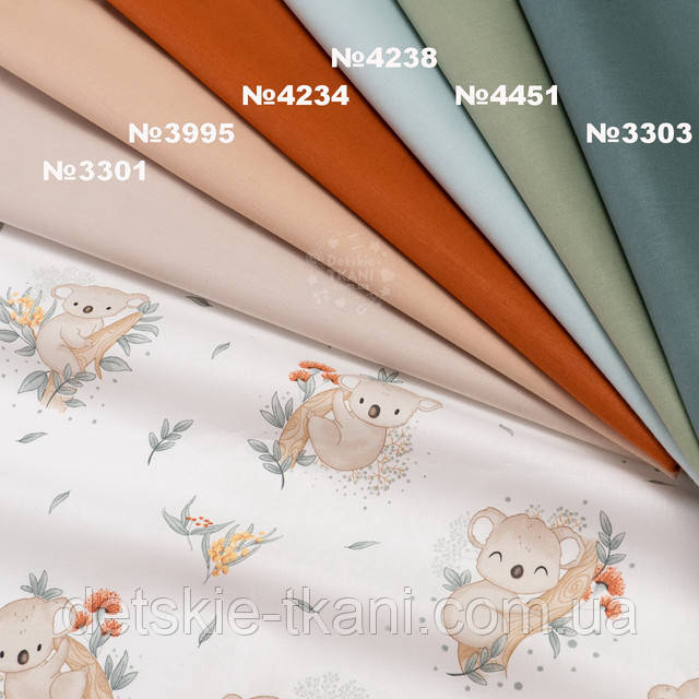 Ранфорс шириною 240 см "Коали на гілках і квіти" на білому тлі, №4260