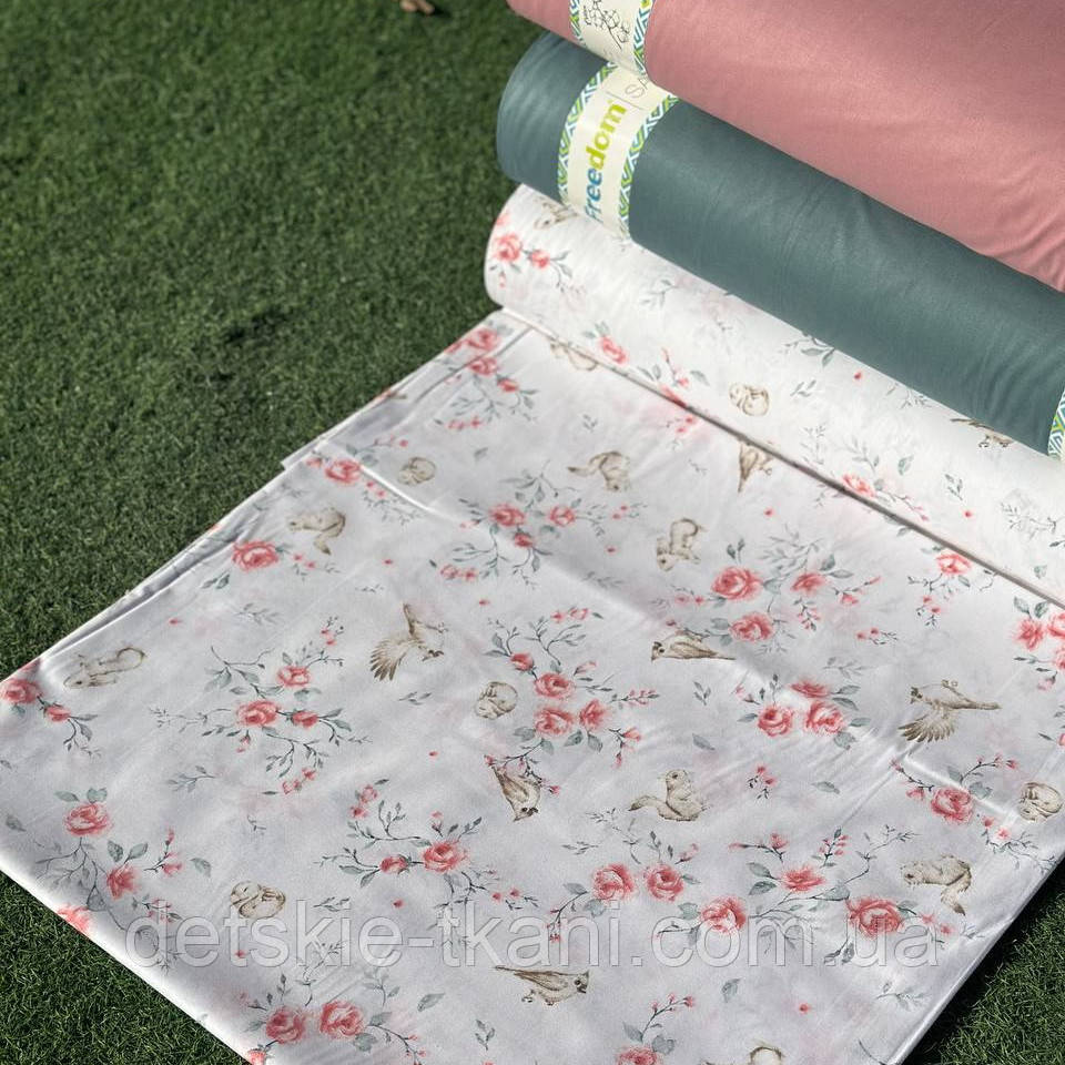 Тканина ранфорс з малюнком "Троянди з пташками, зайчиками та білочками". Підходить для пошиття постільної білизни.